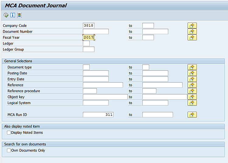 Figure 6, enter the header data in the fields such as Company Code, Document Number, Fiscal Year, Ledger, and Ledger Group. In the General Selections group box, enter the selection criteria in the fields in that section. You also have the option of entering a value in the MCA run ID field. After you enter data for your business needs, click the execute icon. This action displays the screen in