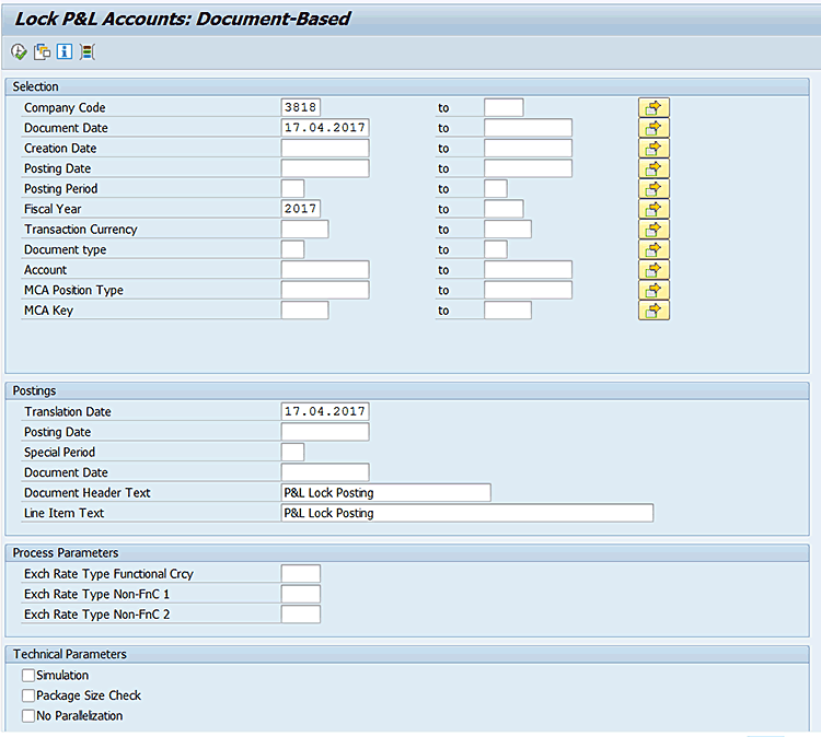 Enter the selection criteria such as company code, document date, posting date, and fiscal year for selecting your P&L line items. The more options you select, the faster the process will be. Enter the translation date, posting date for posting the P&L lock result after processing. You can use the simulation option to simulate your entries before executing in production mode.