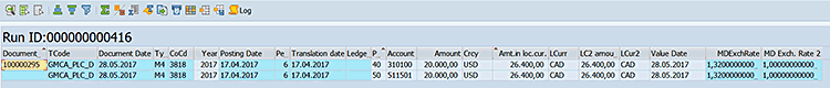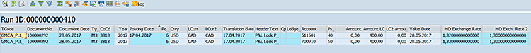 To transform the efforts and revenues that were posted to P&L accounts into the functional currency, execute transaction code GMCA_PLT_D or follow menu path Accounting > Financial Accounting > General Ledger/General Ledger (New) > Periodic Processing > Multi Currency Accounting > Periodic Processing > P&L Processes: Document-Based > Transform Document-Based P&L Accounts. Populate the fields as shown in