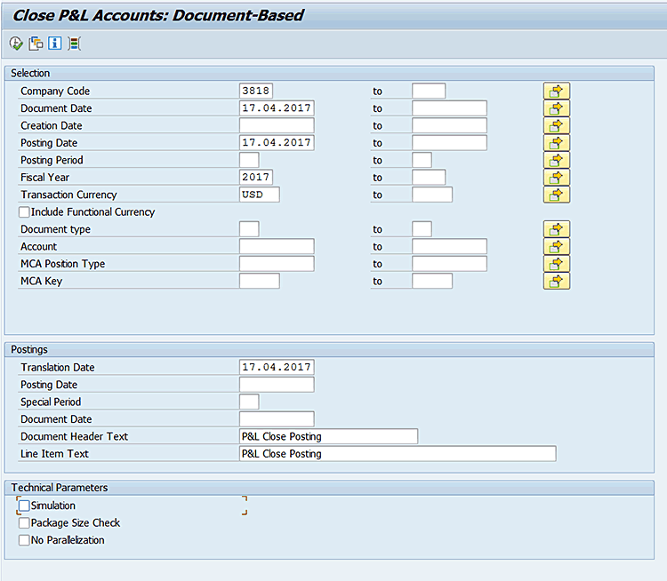 Figure 13 and then click the execute icon. Enter selection criteria such as company code, document date, posting date, fiscal year, and currency for selecting your P&L line items. The more selection options you enter, the faster the process will be. In the Postings section, enter the translation date and the posting date for posting the P&L close result after processing in the Translation Date and Posting Date fields, respectively. If you do not enter the posting date, the system considers the date of execution as the posting date by default. In the Technical Parameters section, you can select the Simulation check box to simulate your entries before executing in production mode.