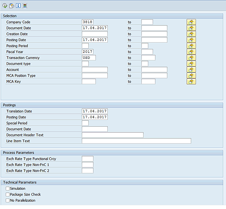 Enter selection criteria, such as company code, document date, posting date, fiscal year, and currency for selecting your P&L line items. The more selection options you choose, the faster the process will be. In the Postings section, enter the translation date, which is used for determining the exchange rate for transaction to functional currency, and the posting date for posting the P&L transform results after processing. In the Technical Parameters section, you can select the Simulation check box to simulate your entries before executing in production mode. After you enter your data, click the execute icon.