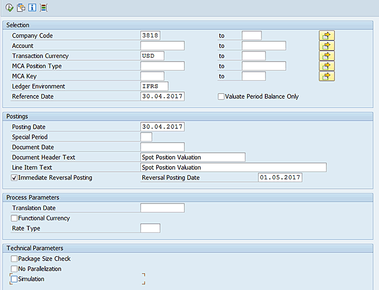 Enter selection criteria, such as company code, account, transaction currency, ledger, and reference date. Select the Valuate Period Balance Only check box for selecting position account line items. The more selection options you enter, the faster the process will be. In the Posting section enter the posting date and the reversal posting date and Immediate Reversal Posting checkbox for posting the spot position valuation results after processing. In the Technical Parameters section you can select the Simulation check box to simulate your entries before executing in production mode.