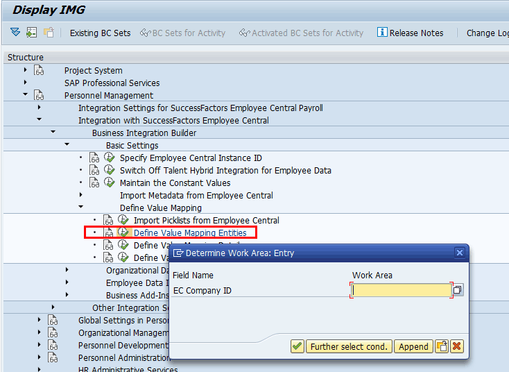 To map the field values from the SAP ERP HCM system to SAP SuccessFactors Employee Central, follow IMG menu path Personnel Management > Integration with SuccessFactors Employee Central > Business Integration Builder > Basic Settings > Define Value Mapping > Define Value Mapping Entities. This path takes you to the pop-up screen in