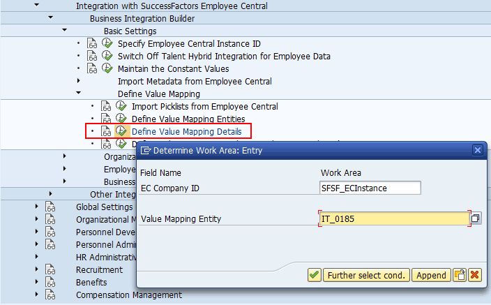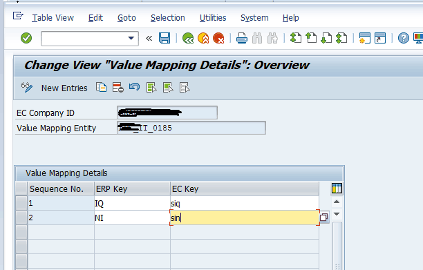 After you define the mapping entity, it’s time to enter the mapping values. Follow IMG menu path Personnel Management > Integration with SuccessFactors Employee Central > Business Integration Builder > Basic Settings > Define Value Mapping > Define Value Mapping Details.