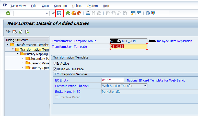 Figure 17 in which the new entry for the template group is displayed. Select the From EC check box for the from Employee Central field (EMPL_REPL). Once you’ve made this entry, click the save icon to save the records.