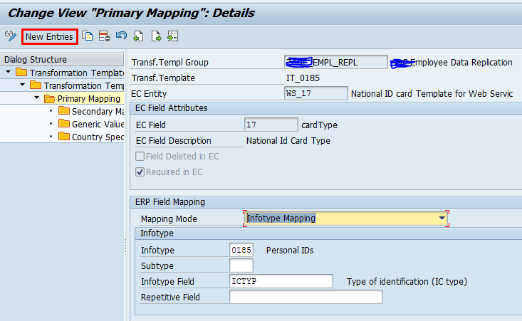 Figure 13. Double-click the Primary Mapping folder to create the field mapping between the IT_0185 fields and the SuccessFactors web service fields. Now click the New Entries button and the screen in