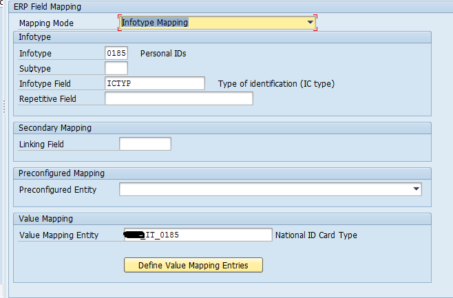 - Value Mapping Entity – Enter any value. In this example, I entered infotype 0185 (IT_0185).