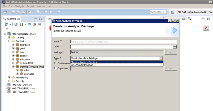 Figure 3). Then select the content package you previously created (in this example, training) and right-click. In the context menu that opens, click New and then Analytic Privilege, and the New Analytic Privilege pop-up window in