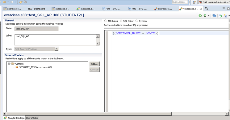 The process for making the SQL analytic privilege dynamic is much more straightforward. For these SQL privileges (in the screen in