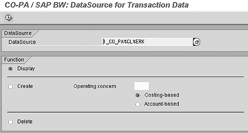 You may enter any name, but the template requires that the first seven characters are 1_CO_PA. If you do not have your own naming convention, the system will automatically place %CL by the client and &ERK by the operating concern. Look at Figure 1. To create a new DataSource, flag the Create option, enter the operating concern for which you want to create the DataSource, and flag whether the DataSource is Costing-based or Account-based. After that, click on the process button or press the F8 key.