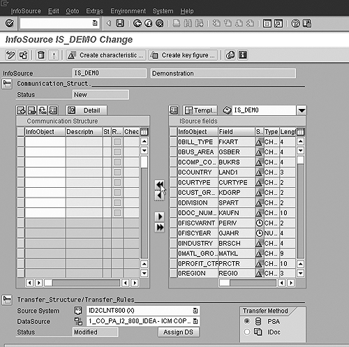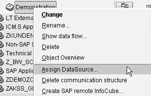After creating the InfoSource, you need to assign a DataSource to it by right-clicking on the InfoSource as shown in Figure 4. After assigning the DataSource, move all the InfoObjects listed in the ISource fields window to the Communication Structure window. (See Figure 5.) You may now activate the InfoSource.