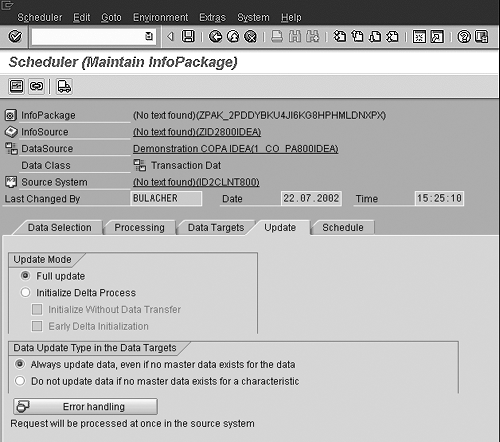 Before you can use the delta update, you must initialize the delta process in the Update folder of the Maintain InfoPackage screen. This is possible with or without performing a data transfer. It takes longer with a data transfer, because all the data is loaded from the CO-PA source system. Flag the Initialize Delta Process option and then check the Initialize Without Data Transfer option, as shown below.1