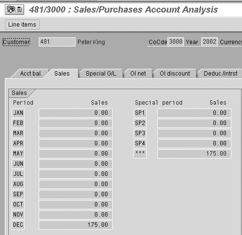 As a result, when I access the Sales section of the Customer Analysis standard A/R report (FD11), the $175 shows up in the December field of the sales tab (the posting date in Figure 2 was December 9, 2002). See Figure 5.