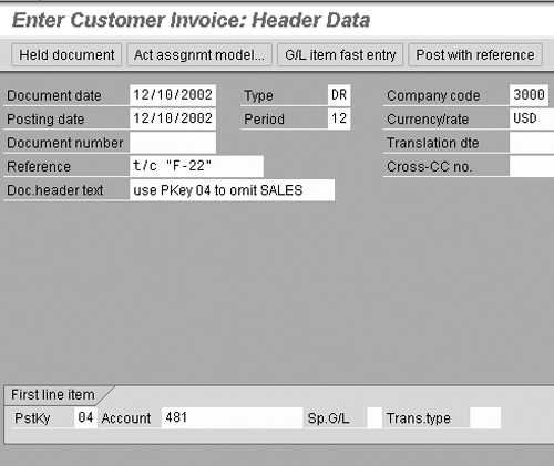 Notice in Figure 2 that the end user has no chance to type in a posting key. Instead, he or she can simply type in an amount that should be debited to the customer. This is because the FB70 transaction has its customer posting key defaulted in with R/3 Release 4.6.1
