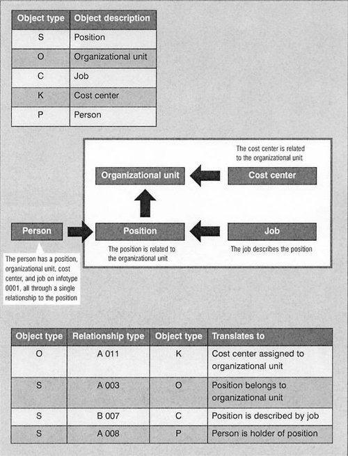 Let’s look at an actual scenario. Company X has a new hire named John Smith. The first step is to create a position or to find an existing one in the Organizational Management (OM) component in SAP. For this example, you create the position (object number 5252000, object description Shipping Clerk). Next, you initiate a hiring event on the PA side and create a personnel number for John Smith (PERNR = 12345). During that hiring event, you create a relationship between the two existing objects, so that personnel number 12345 is related to position number 5252000 (in other words, John Smith is a shipping clerk). Behind the scenes, John also inherits all the other relationships attached to the position object, as shown in Figure 1.