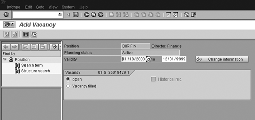 If your company does not distinguish between vacant and unoccupied positions — that is, you consider all unoccupied positions to be vacant — you can set an indicator rather than maintain the vacancy infotype. It is not mandatory that you utilize vacancy processing in SAP. You should, however, use vacancy processing if you install the following HR components: Personnel Cost Planning, Career and Succession Planning, or Applicant Administration. For these submodules, reuse of positions when they become vacant makes your processing easier. In the case of Succession Planning, if you create successor relationships from a person to a position and the position becomes vacant, you can easily identify who the successor to that position is and fill it accordingly.