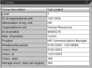 Report RHXFILLPOS not only identifies the positions that are open for the specified time intervals and organizational units, but also displays the beginning and ending dates of the period during which the position was unoccupied, the names of the new holders at the end of each period (if any), and the sum of the number of days those positions remained unoccupied during that period (Figure 1). If you want to see the detail of any individual line item in the output, highlight the line you wish to view and click on the choose-detail icon (or press Ctrl+Shift+F3). Clicking the choose-detail icon displays a pop-up box (Figure 2) with line item detail, including object IDs that are not displayed in the original output screen.