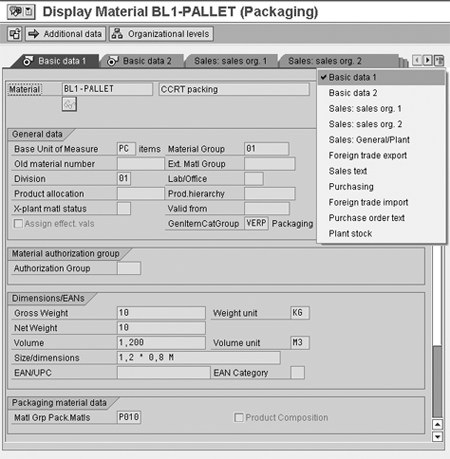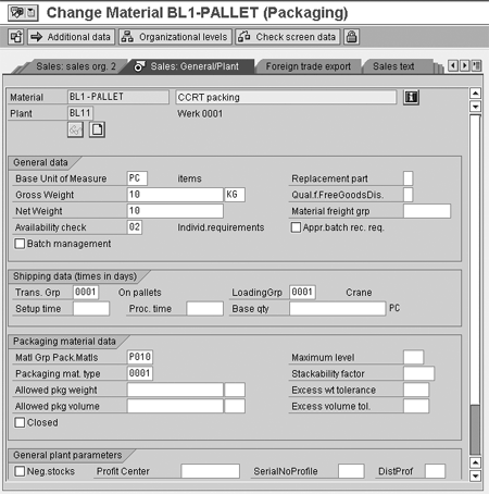 You must also create a parameter for the packing material for the sales organization, division, and distribution channel. When you select the Sales: General/Plant view in Figure 9, you see a pop-up window asking you to populate the plant, sales organization, and distribution channel fields. You can also see the organization level by clicking on the Organizational levels button.