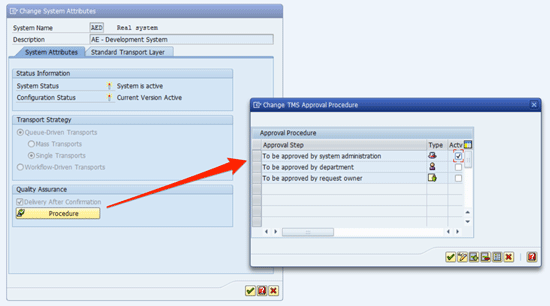 The standard SAP system offers TMS QA, accessible via transaction code STMS_QA (Figure 2). By defining a system as a QA system, you can activate a QA procedure. To do so check the Delivery After Confirmation check box and click the Procedure button. In the pop-up screen you then mark the check box to activate the selected approval steps and confirm by clicking the green arrow icon.