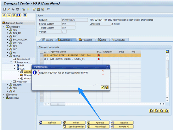 In Figure 4 you can see a pending approval within Transport Center. The transport refers to a change request documented with number 224804, for which the documentation is stored in a non-SAP change management tool. The organization in question has a rule to not transport changes until business approval is granted within the external change management tool. While approving, Transport Center triggers a web service, implemented within a Business Add-In (BAdI) offered by the SAP add-on. In real time it verifies the approval status of the referenced change request number. In this example the referenced Remote Function Call (RFC) number was not yet approved by the business, which prevents the transport from being approved.