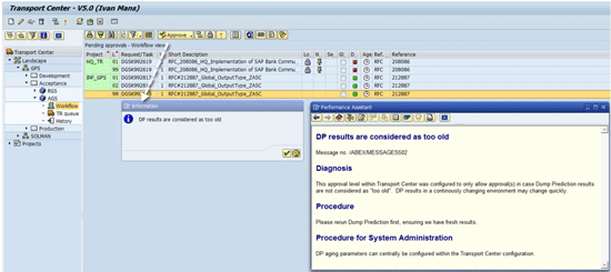 When your system is configured to trigger an immediate import after the last approval is received, you have to ensure the transport does not damage the receiving box (e.g., a transport with missing objects causing short dumps or a program that would be wrongly downgraded). To minimize the risk for erroneous imports, the system can be configured to allow imports only for transport requests that have been recently verified. Figure 5 shows that a transport approval cannot be granted because dump prediction results are too old to be fully reliable. I cover the scope of such automated checks later, when I talk about downgrade protection and dump prediction.