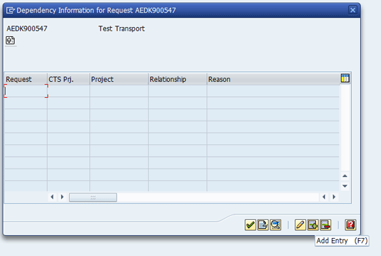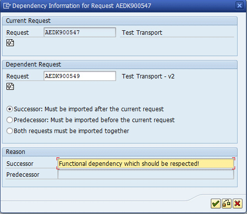 Insert a new dependency by clicking the add entry icon (the icon with the + sign) in Figure 6. In the pop-up screen that appears (Figure 7) you document the type of dependency (such as successor or predecessor). For example, you can add transport AEDK900549 as a successor to AEDK900547 and document the reason as Functional dependency, which should be respected. You save a dependency by clicking the green check mark shown in Figure 7.