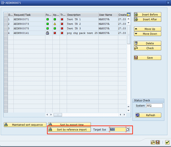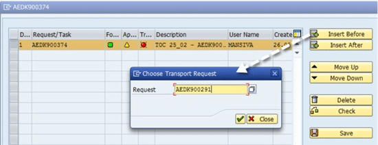 By selecting the transport AEDK900374 and clicking the Insert Before button you can enter the missing transport number, AEDK900291, as a prerequisite. Click the Save button to save the import sequences. Once the sequence is committed, dump prediction would rerun and the red light shown in Figure 23 would automatically turn into a green led icon.