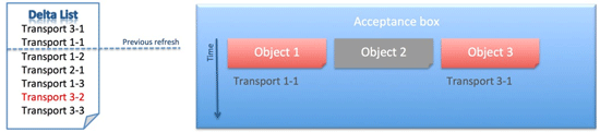 Figure 12 shows an acceptance box after the refresh from production. The versions are reset to the versions that are also active in production. The delta list shows the differences between the old and new state of the acceptance box. Transports that have never moved to production, but that were imported into the earlier version of the acceptance box are shown on the delta list.