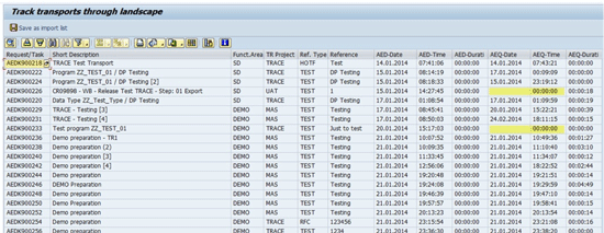 In my example you compare all transports imported into AED after 1 January 2014 (e.g., the date of your previous system refresh) against the import status in AEQ. The final list is sorted on AED import time. Transports highlighted in the output list generated by the tracking report (shown in Figure 14) are actually missing in AEQ. The screen shown in Figure 14 appears after you click the execute icon in Figure 13.