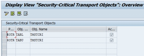 Figure 15 shows an example of a configuration entry for which you document the table definition and table content for table TMSTCRI (security-critical transport objects) as critical. Entries shown in Figure 15 are no longer transportable, as they have been added as security critical.