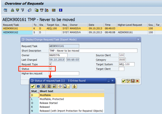 There is, however, one option that not many people may be aware of for physically deleting an already released transport request using a standard SAP system. SAP report RDDIT076 allows you to select and modify a single transport. After a transport request is selected, you can double-click the main transport request. An Expert Mode pop-up screen is shown in which you can edit certain parameters (Figure 17). This way, you can change the status from R (released) to D, which stands for modifiable. After clicking the save icon, you can delete the transport using your standard transport workbench.