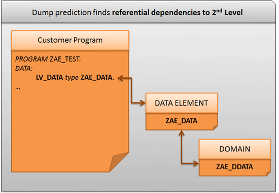 In addition to version dependencies, you also have referential dependencies. Whenever a program such as the one shown in Figure 21 uses a table, the transport is only successful when the correct version of the table and all used data elements are available. A data element only generates correctly if the contained domain is also available. Referential dependencies can be identified up to three levels deep.