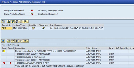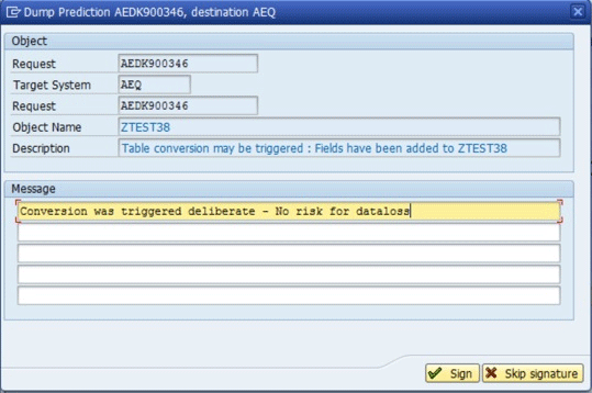In certain scenarios you may need to bypass specific versions or ignore known warning messages. Transport Center therefore allows you to overrule or sign dump prediction errors and warnings (Figure 25), although details are recorded in the transport log. To complete this task, click the red traffic light in the column Signed (Figure 23). In the pop-up screen that appears, you can document reasons for ignoring the error or warning message. Click the Sign button to record and store your approval for the Transport Center to ignore the warning.