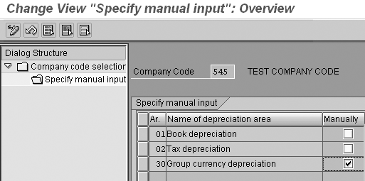 In Figures 8 and 9, note also that the group currency data fields are available for input. To make these available, follow IMG menu path Financial Accounting>Asset Accounting>Asset Data Transfer>Parameters for Data Transfer>Options>Transfer Foreign Currency Areas. Then check the check box for the depreciation area, in this example, 30, which allows manual entry of USD values (Figure 10).