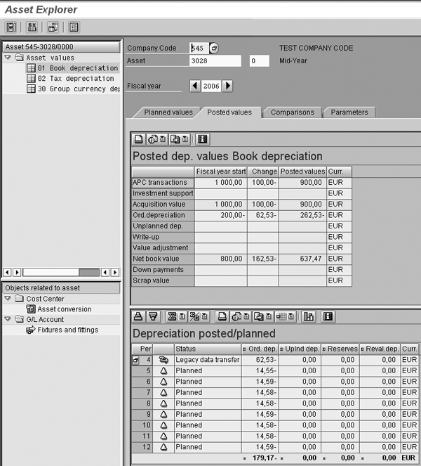 After you save the asset, you can see how the loaded data is reflected in the created asset by displaying planned and posted asset values (Figures 11 and 12). You can find this by following application menu path Accounting>Financial Accounting>Fixed Assets>Asset>Display>Asset (AS03).