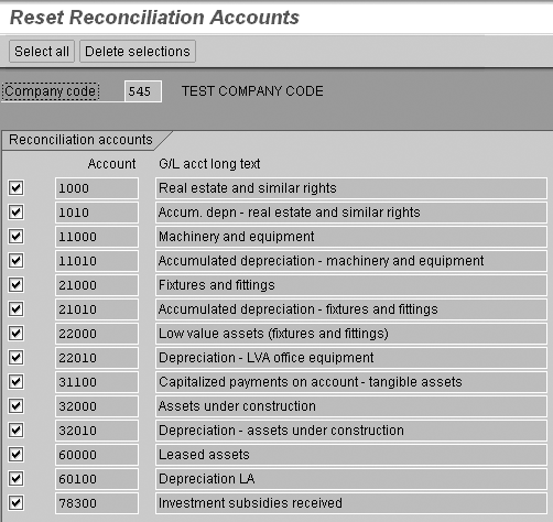 2. Transfer balances. Once you decide the loaded asset balances are correct, you need to make the entries manually in the corresponding G/L cost and accumulated depreciation accounts. This is because these accounts are not updated automatically by the system when loading the data in FI-AA. SAP defines these accounts as asset reconciliation accounts and you cannot post to them directly. Therefore, you must reset reconciliation accounts to enable direct posting to them (Figure 14). To access this transaction, follow IMG menu path Financial Accounting>Asset Accounting>Preparation for Production Startup>Production Startup>Reset Reconciliation Accounts.