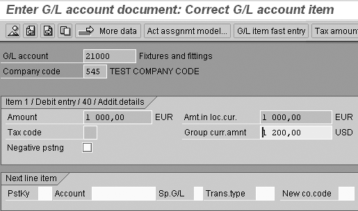 After running the process, you can make the required journal entries to these accounts. Note that since you are maintaining a group currency depreciation area, the journal entry must reflect group currency values. Do this by entering the amount in the group currency field (Figure 15). These are the amounts of your legacy asset ledger in local currency and group currency.