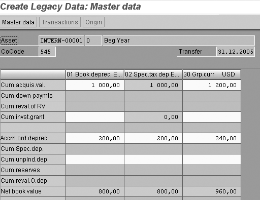 R/3 and ECC provide a method for transferring balances using transaction OASV, but you cannot override the calculated group currency amount. This means that if you need to transfer legacy amounts in the group currency you have to use the journal entry method mentioned above. To access this transaction follow IMG menu path Financial Accounting>Asset Accounting>Preparation for Production Startup>Production Startup>Transfer Balances.