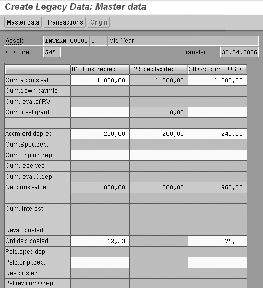 When setting the take- over date to a mid-year date of 30.04.2006, you then can enter data in the Ord.dep.posted (ordinary depreciation posted) field in Figure 8. The Transactions button then becomes available for entering mid-year transactions (Figure 9).