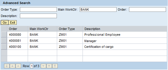 In the screen that appears (Figure 17) enter the main work center (BANK, in my example) in the Main WorkCtr column and click the Go button. This creates a list of all the orders matching the main work center you have entered (Figure 18). Select a line by clicking the gray square on the left of the line. This action automatically fills in the Rec. Order field in your timesheet (Figure 19).