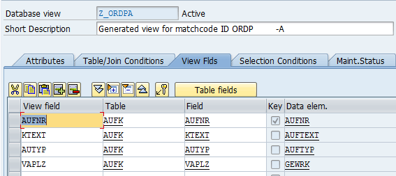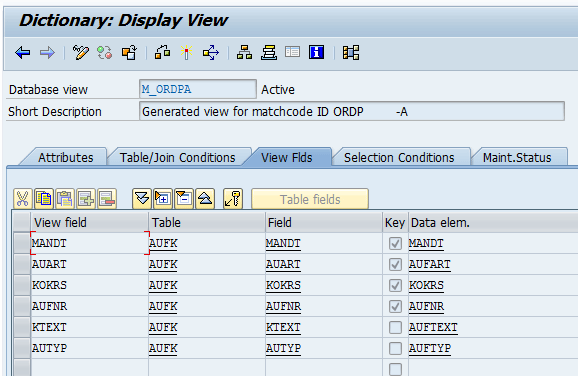 To add a new search help to the RAUFNR field you can use the database selection method (Figure 5). This view includes the fields that are displayed when you search for an order by providing a value in the search help (Figure 2). When you want to search for values other than the ones available in the standard search help, you need to add these fields to the database view. Once they’re added, the new search help provides these fields on the screen.