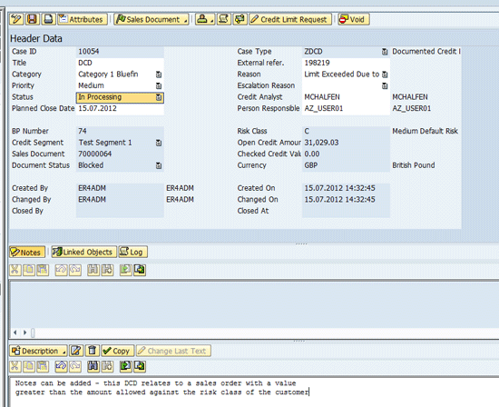 The Documented Credit Decision (DCD) functionality is a case-based solution to track credit decisions. The traditional method to approve a blocked sales order would be for sales administrator clerks to review the order and make a decision. If it fell out of their approval level, they may make a phone call to seek further approval. The sales order would be approved, and run through into billing. If there was an issue with the customer paying the invoice, a review may take place to identify why the sales order was unblocked. Depending on the industry and type of customer, the volume of these approvals may be high, leading to uncertainty as to the true reason for the decision. Some clients may have a paper-based solution, or keep email approvals; however, none of these is system generated or held centrally.