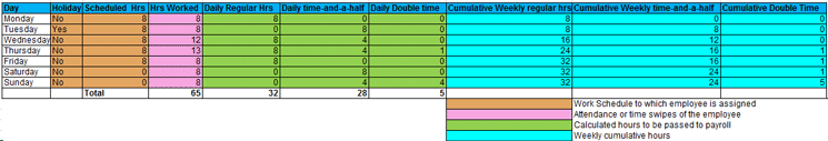 Figure 2 is a sample calculation of regular, time-and-a-half, and double-time for a week based on the above agreement rules.