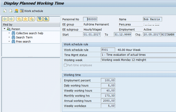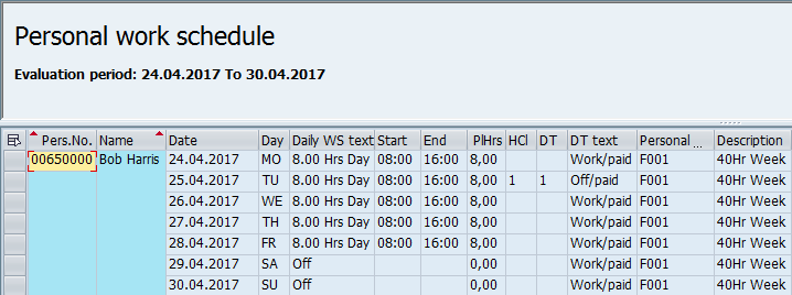 - The first, second, and third columns (i.e., Day, Holiday, and Scheduled Hrs) are predefined in the system and map to the work schedule. The work schedule also contains the holidays. The work schedule rule is assigned to the employee’s master data in infotype 0007 (i.e., planned working time as shown in Figures 3 and 4).