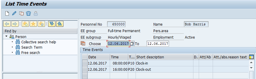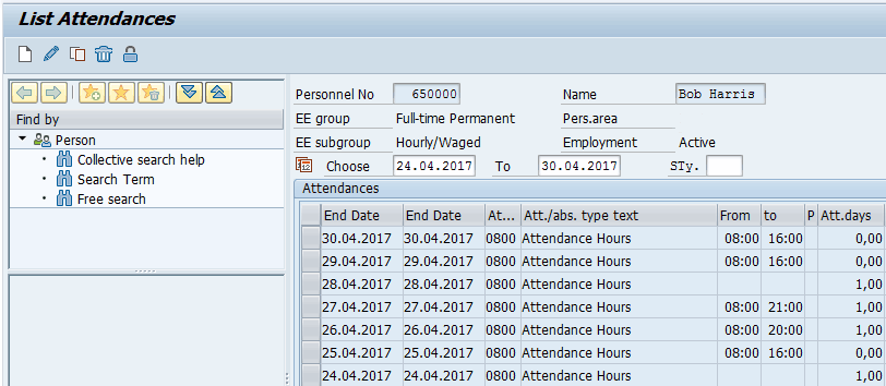 If the attendance is captured using biometric or card terminals, it is stored in infotype 2011. The entries show up as clock-in and clock-out as displayed in