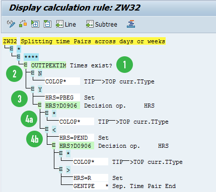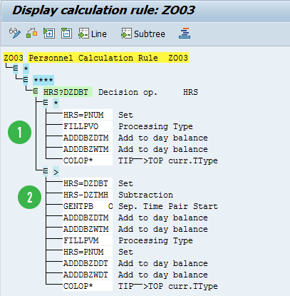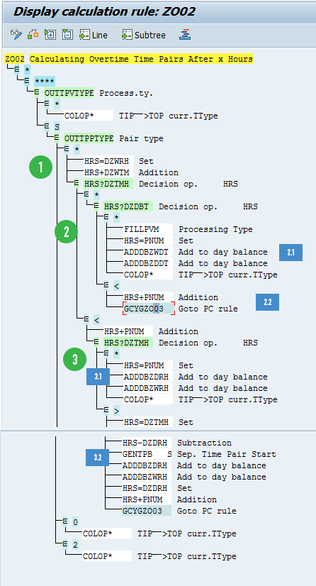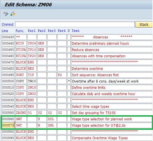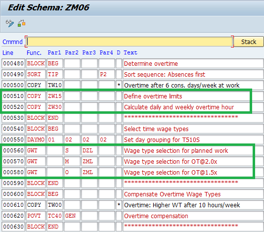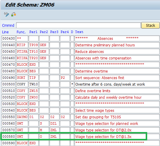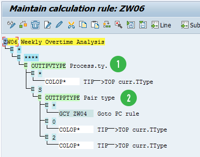 In the previous rules, I marked the time pairs for time-and-a-half hours with processing type O, while the time pairs for double-time hours were marked with processing type M. The time pairs for regular hours were marked with processing type S. Therefore, in the schema ZM06 you need to have separate functions to generate wage types for each of these processing types.