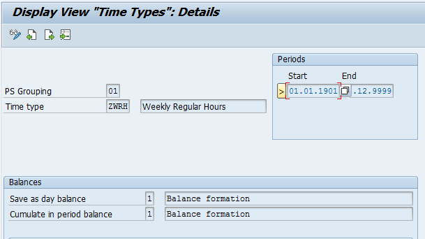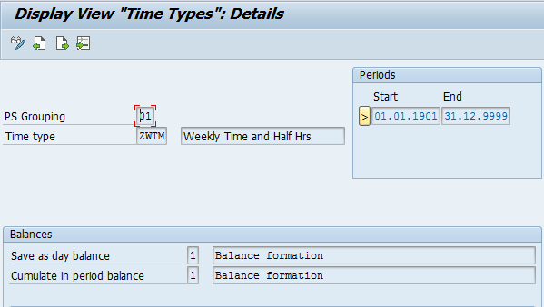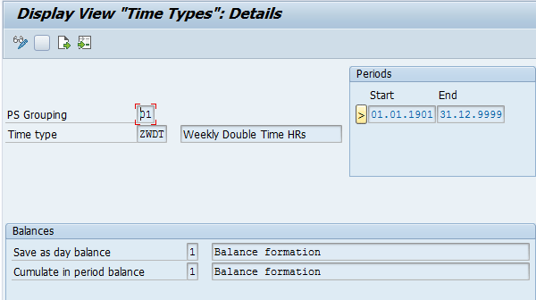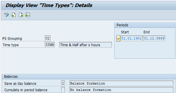 When a value is required for day calculation (e.g., the number of hours after which double-time starts), then the day balance indicator is set to 1 (e.g., time type ZDBT in
