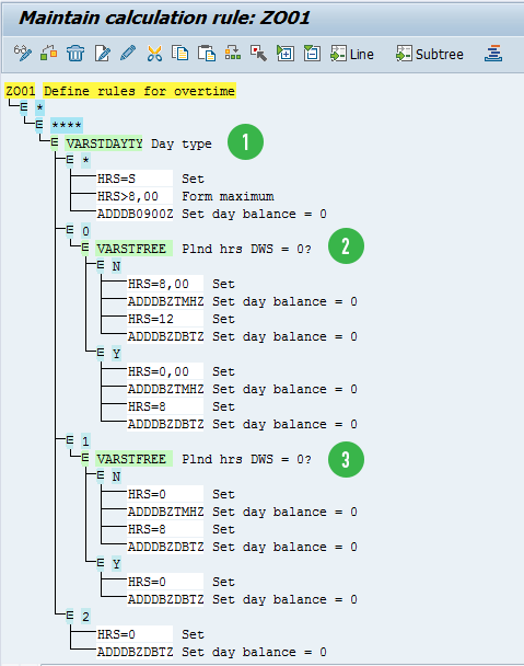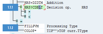Figure 11. The first operation, VARSTDAYTY, checks the type of the current day. If it is a non-holiday, then it branches out to value 0 (detailed in 2 below) and if it is a holiday, then it branches out to value 1 (3 below). For special day types, it branches out to value 2, and for any other type of day, it would branch out to *.