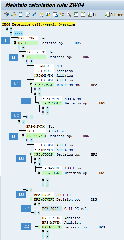Operation HRS?CDBLT compares the value of HRS with constant DBLT (limit for weekly hours before double-time starts, stored in constant DBLT of table T511K). If the value of HRS is greater than that of DBLT, then it branches to condition > (1.2.2.2.2); otherwise, it branches to condition * (1.2.2.2.1).
