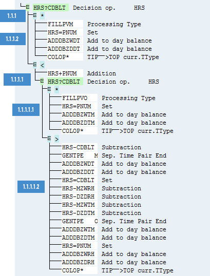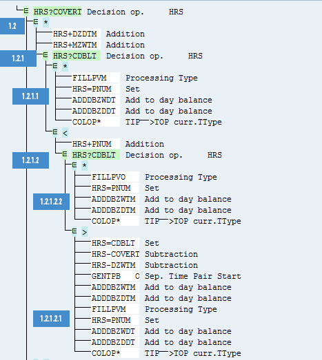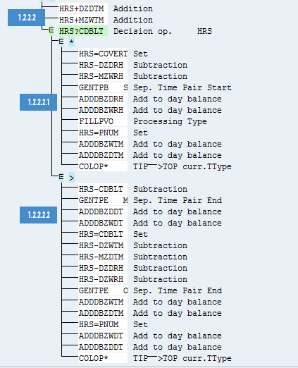 Figure 25. The value in HRS is compared with the daily working hours limit for double-time starts (DZDBT). If the value of HRS is less than DZDBT, then fill the processing type with value O. Also, add the number of hours of the current time pair to ZDTM and ZWTM.